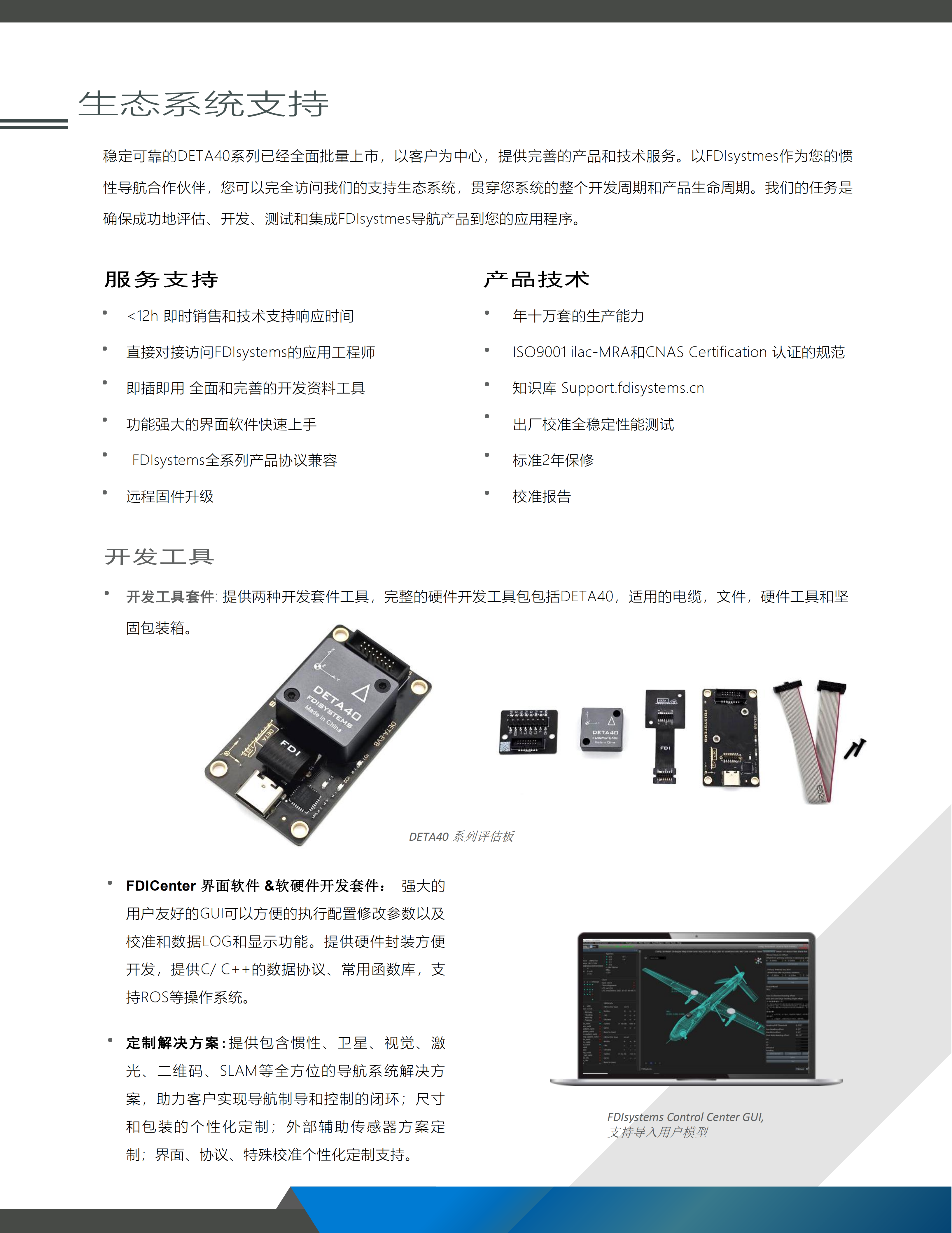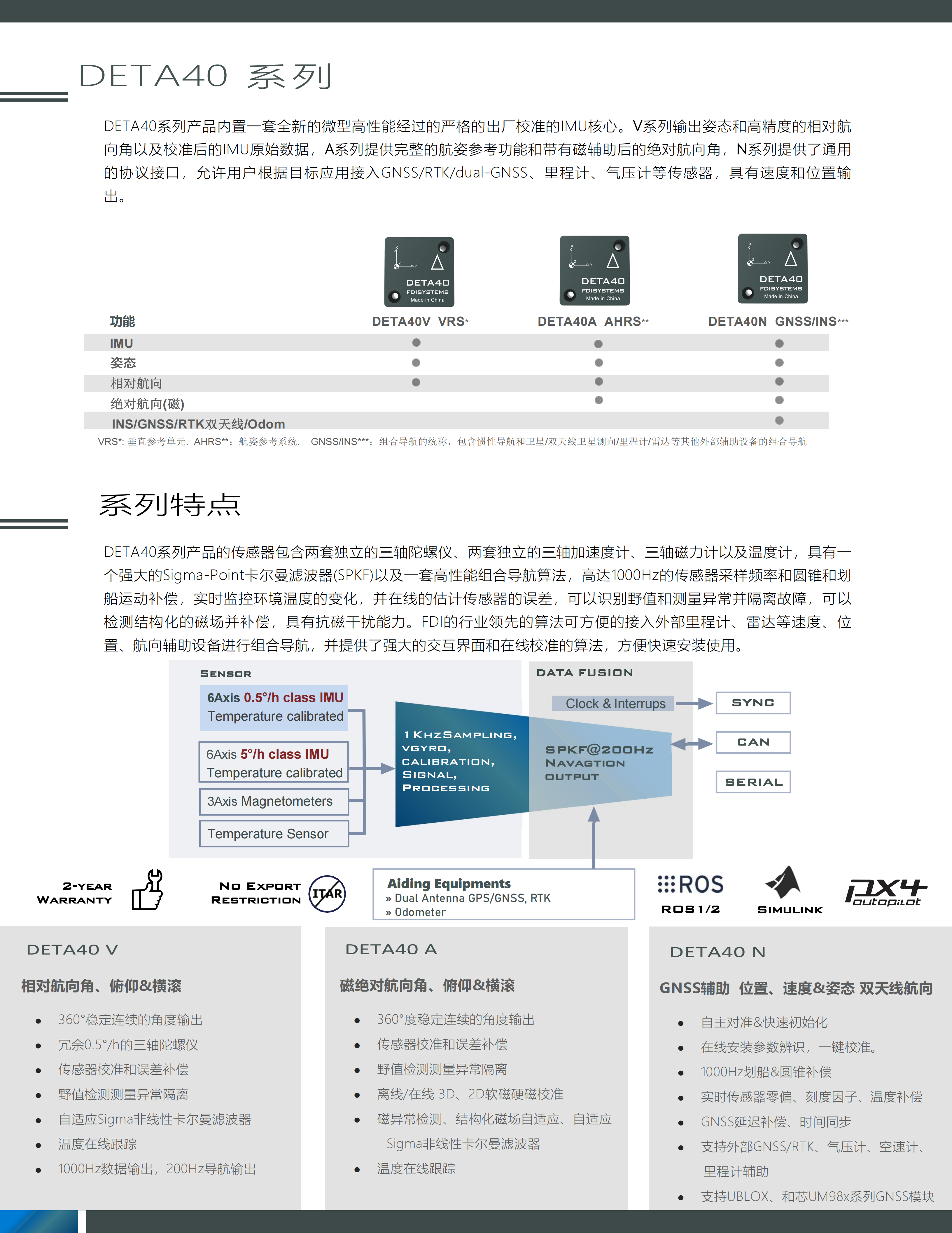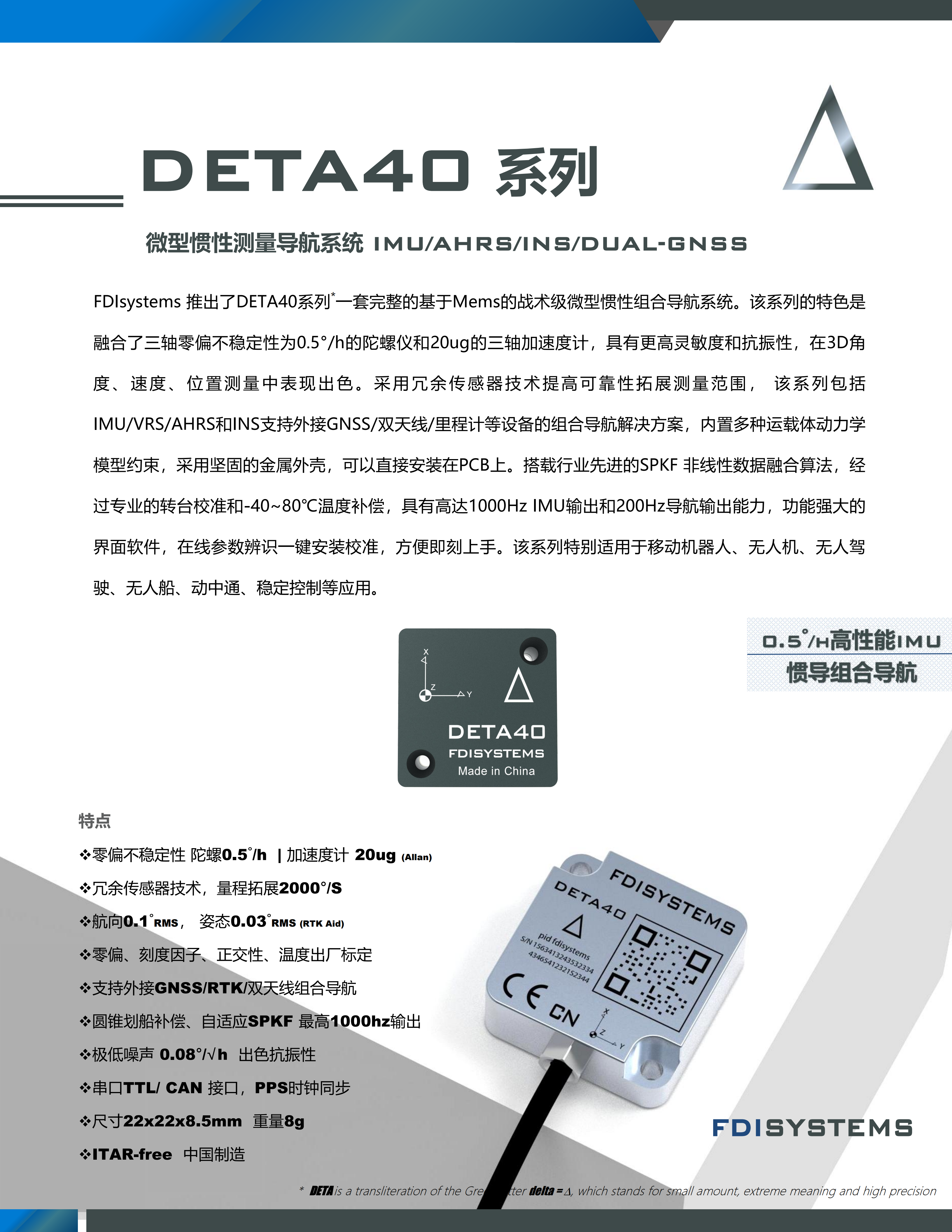 FDIsystems 推出了DETA40系列*一套完整的基于Mems的战术级微型惯性组合导航系统。该系列的特色是融合了三轴零偏不稳定性为0.5°/h的陀螺仪和20ug的三轴加速度计,具有更高灵敏度和抗振性,在3D角度、速度、位置测量中表现出色。采用冗余传感器技术提高可靠性拓展测量范围, 该系列包括IMU/VRS/AHRS和INS支持外接GNSS/双天线/里程计等设备的组合导航解决方案,内置多种运载体动力学模型约束,采用坚固的金属外壳,可以直接安装在PCB上。搭载行业先进的SPKF 非线性数据融合算法,经过专业的转台校准和-40~80℃温度补偿,具有高达1000Hz IMU输出和200Hz导航输出能力,功能强大的界面软件,在线参数辨识一键安装校准,方便即刻上手。该系列特别适用于移动机器人、无人机、无人驾驶、无人船、动中通、稳定控制等应用。